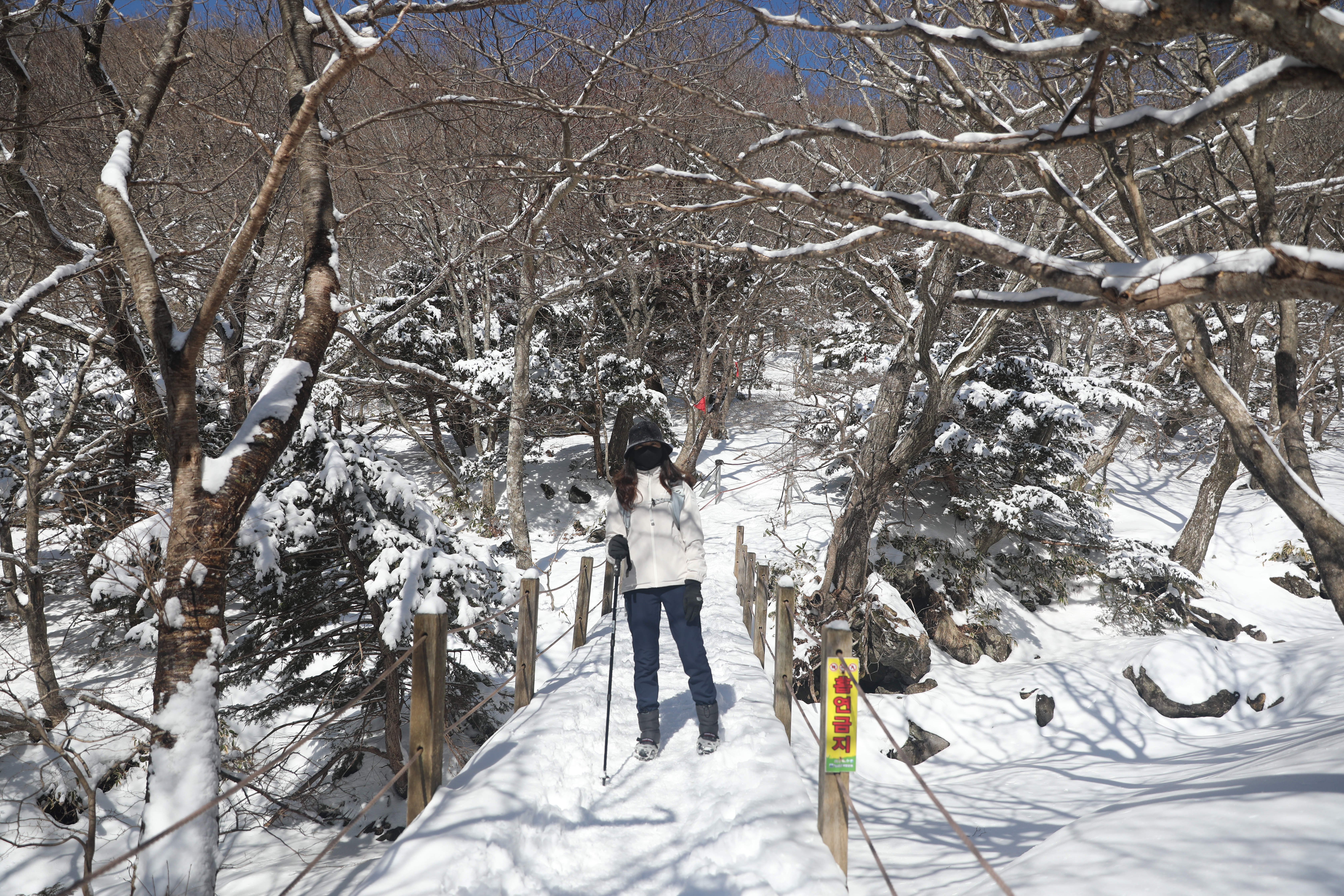 원래는 이 길이 나무계단으로 정상까지 이어져있는데, 밤새 내린 폭설로 인해 그냥 오르막길 수준이었다.