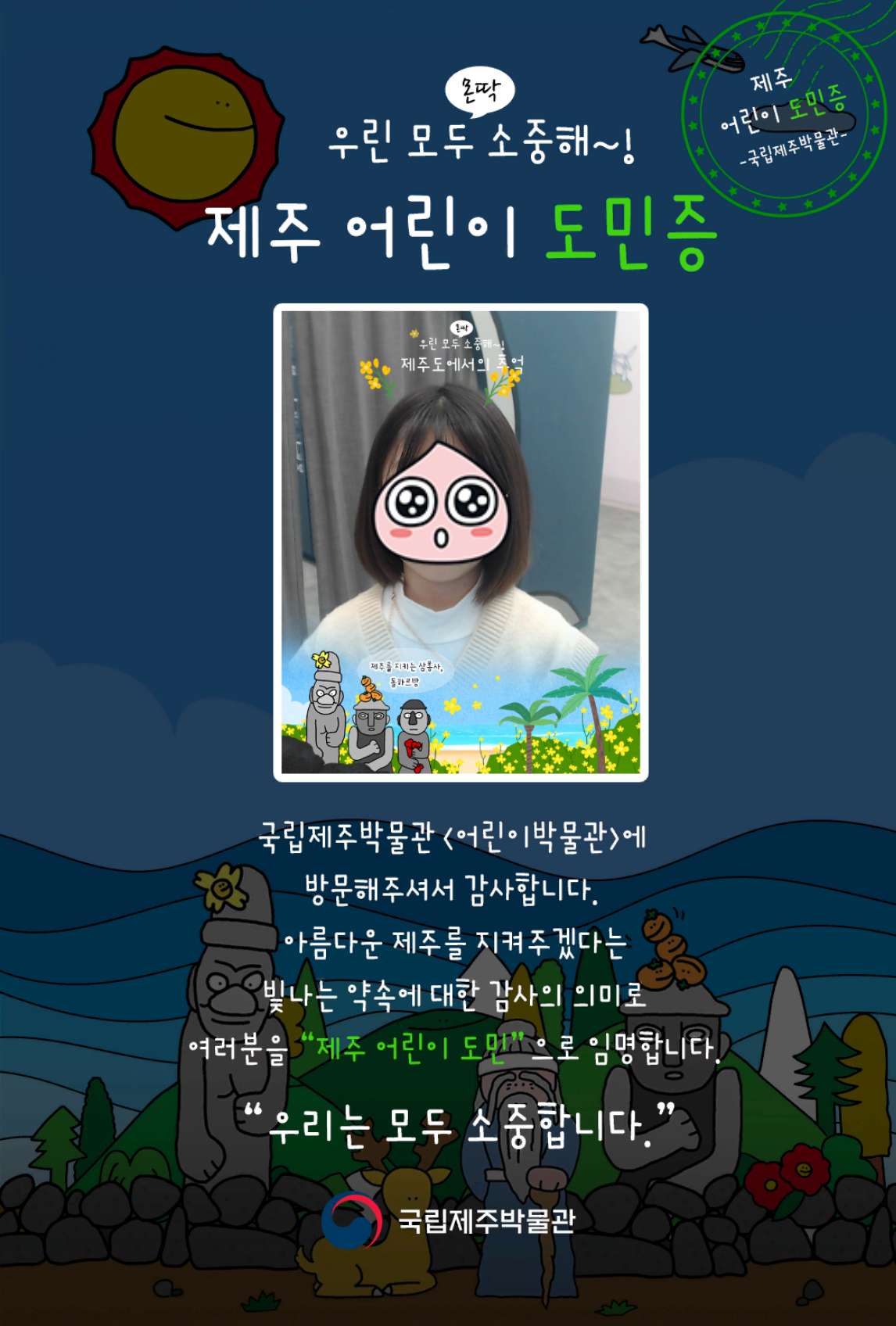 스티커 사진을 찍으면 "제주 어린이 도민증"을 다운받을 수 있다.